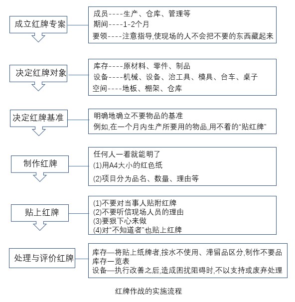 貼附的紅牌移往紅牌集中處后,應予以記錄。將貼上紙牌者,按永不使用、滯留品區分,制作不要品庫存一覽表,對于設備-執行改善之后,造成困擾阻礙時,不以支持或廢棄處理。紅牌作戰看板流程具體細節內容如上圖所示。